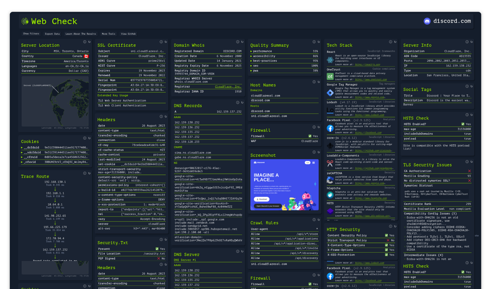 I created Web-Check, as there wasn't yet any single tool which is able to fetch, analyze and collate all this information in one place, and without needing any special setup or technical skill from the user.